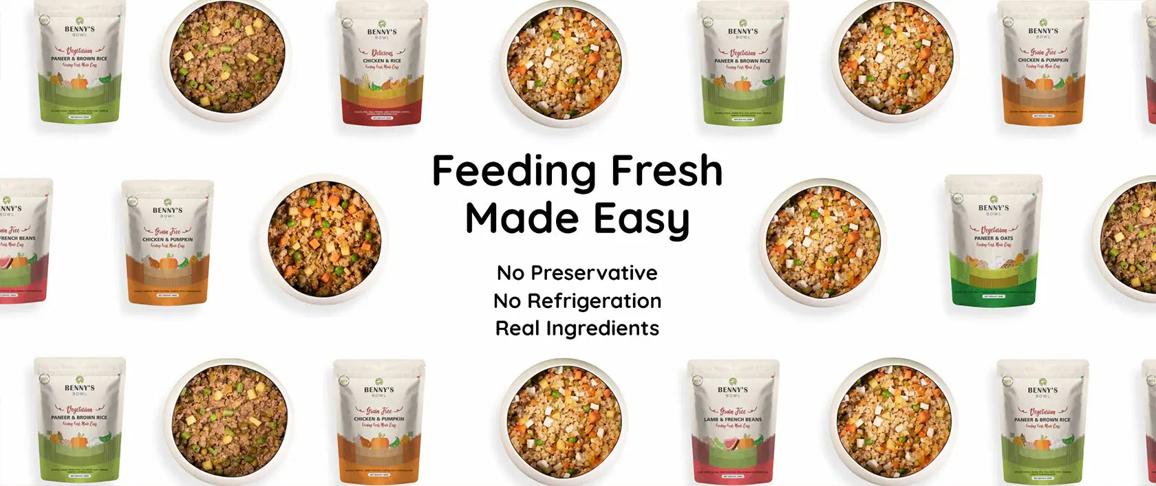 You can feed Benny’s Bowl’s meals to your pooches once they turn 4 weeks old. Make sure that you transition them from a liquid diet to solid diet gradually over a period of 10-15 days to ensure a comfortable transition.